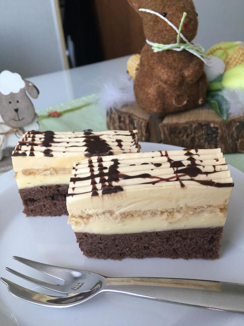 Na bebe sušenky naneseme karamelový krém a postříkáme čokoládovou polevou.