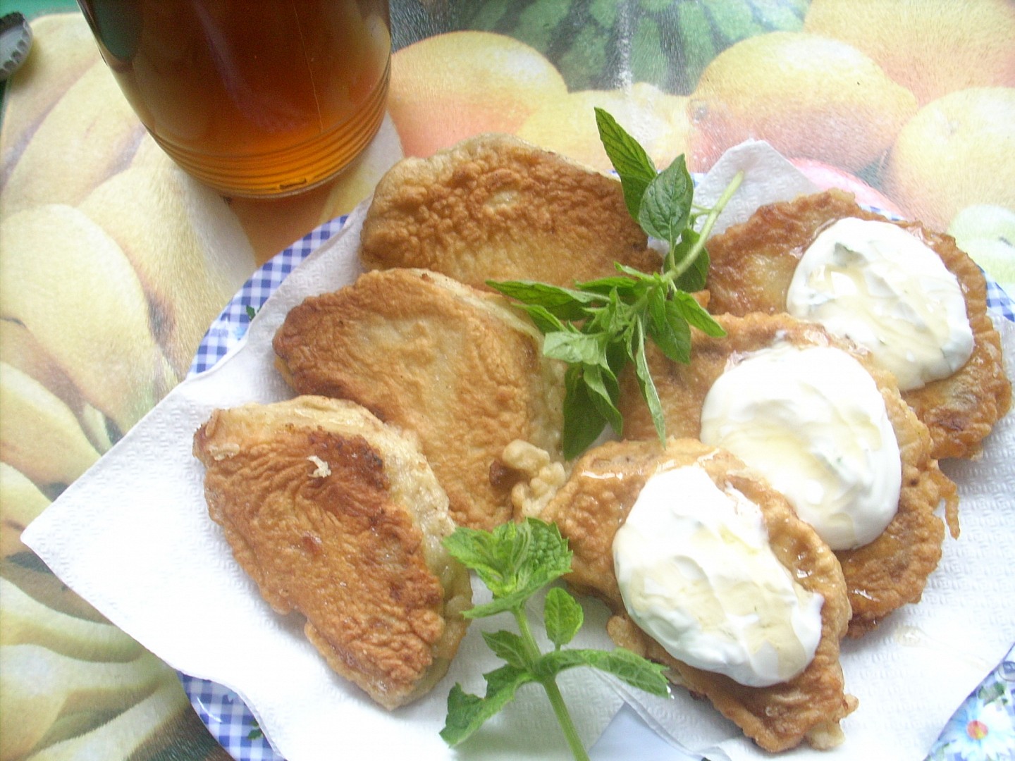 Zakysanou smetanu smícháme se sekanou mátou. Ananas nakrájíme a obalujeme v těstíčku. Smažíme dozlatova v rozpáleném oleji. Servírujeme se zakysanou smetanou a skořicovým cukrem nebo můžeme pokapat medem.