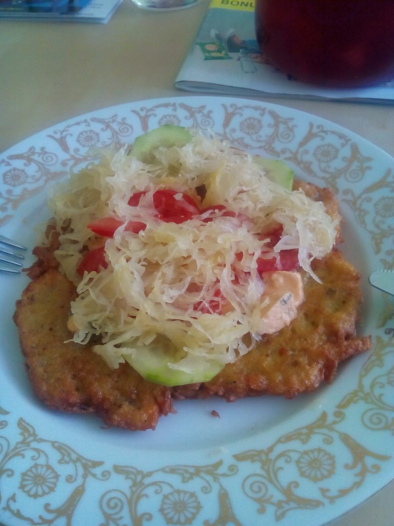 Na vysmazenou placku pokladame hermelin, nivu, zeleninu a posypeme kyselým zelim.