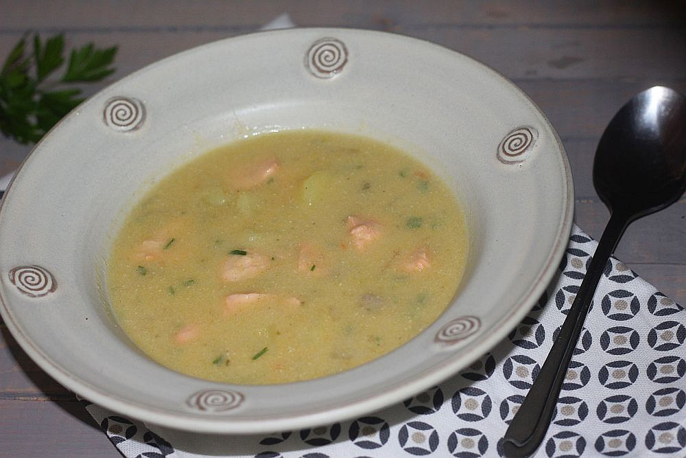 Do hrnce vrátíme odloženou polévku, přidáme i připravené kousky lososa a při mírném varu asi 3-5 minut vaříme.