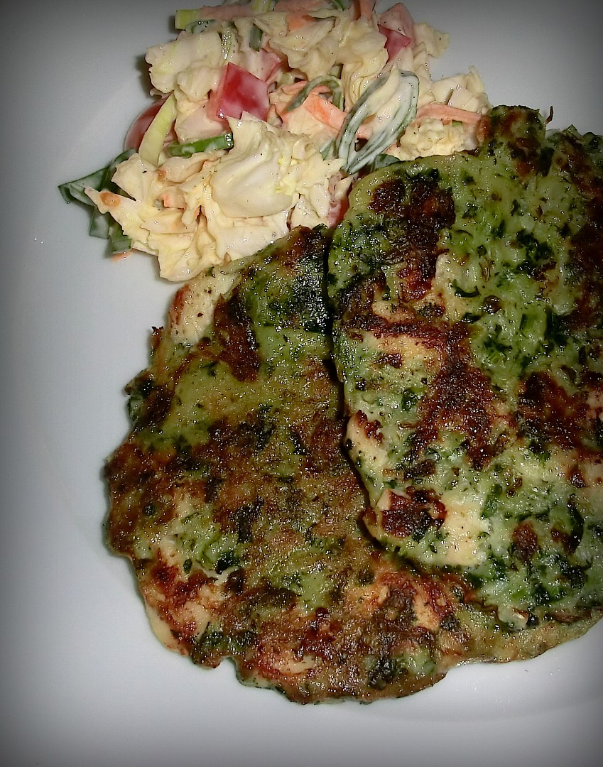 Můžeme podávat se zeleninovým salátem. Tento byl ze zbytků z lednice – pekingské zelí, pórek, červená paprika, nastrouhaná mrkev, cherry rajčátka a smíchané s majonézou.