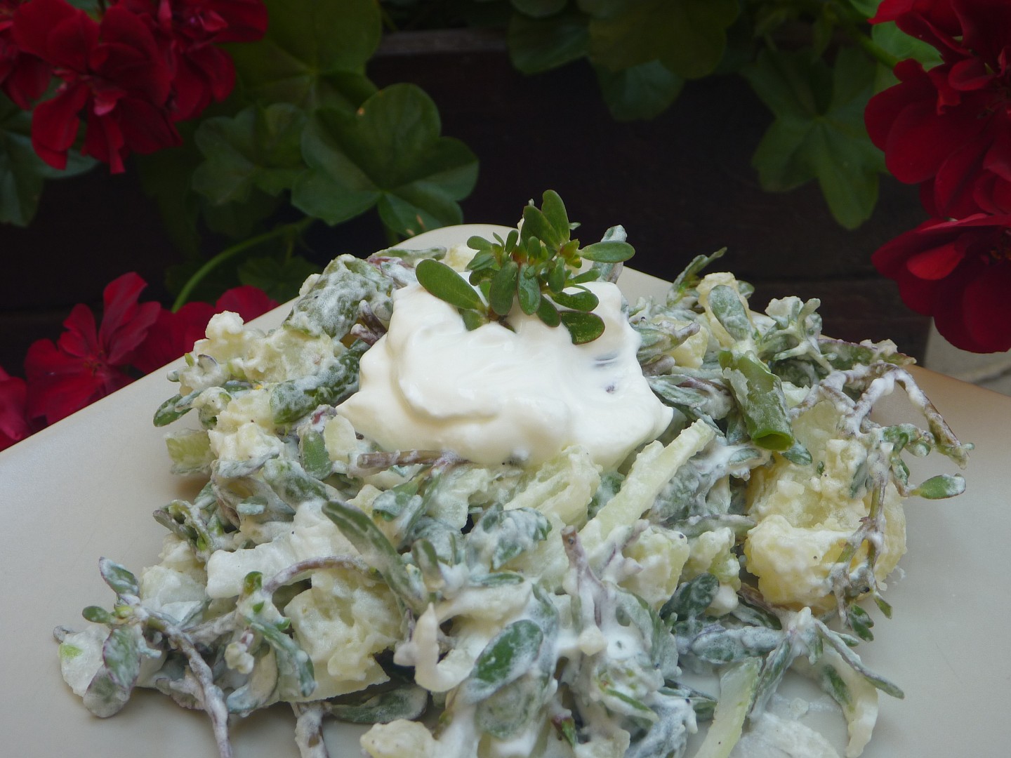 Zmiešame zemiaky, cibuľu, lusky, prekrájanú šruchu, osolíme , okoreníme, pokvapkáme citrónom a zmiešame s kyslou smotanou.