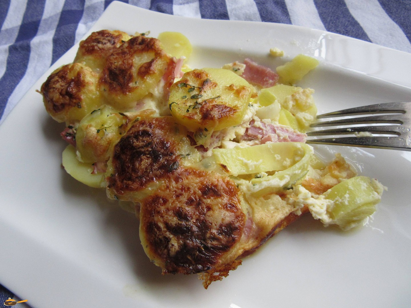 Zapékací misku vytřeme máslem a na dno naskládáme část brambor. Na brambory dáme sem tam nastrouhaný česnek, posypeme je tymiánem, pórkem a šunkou.