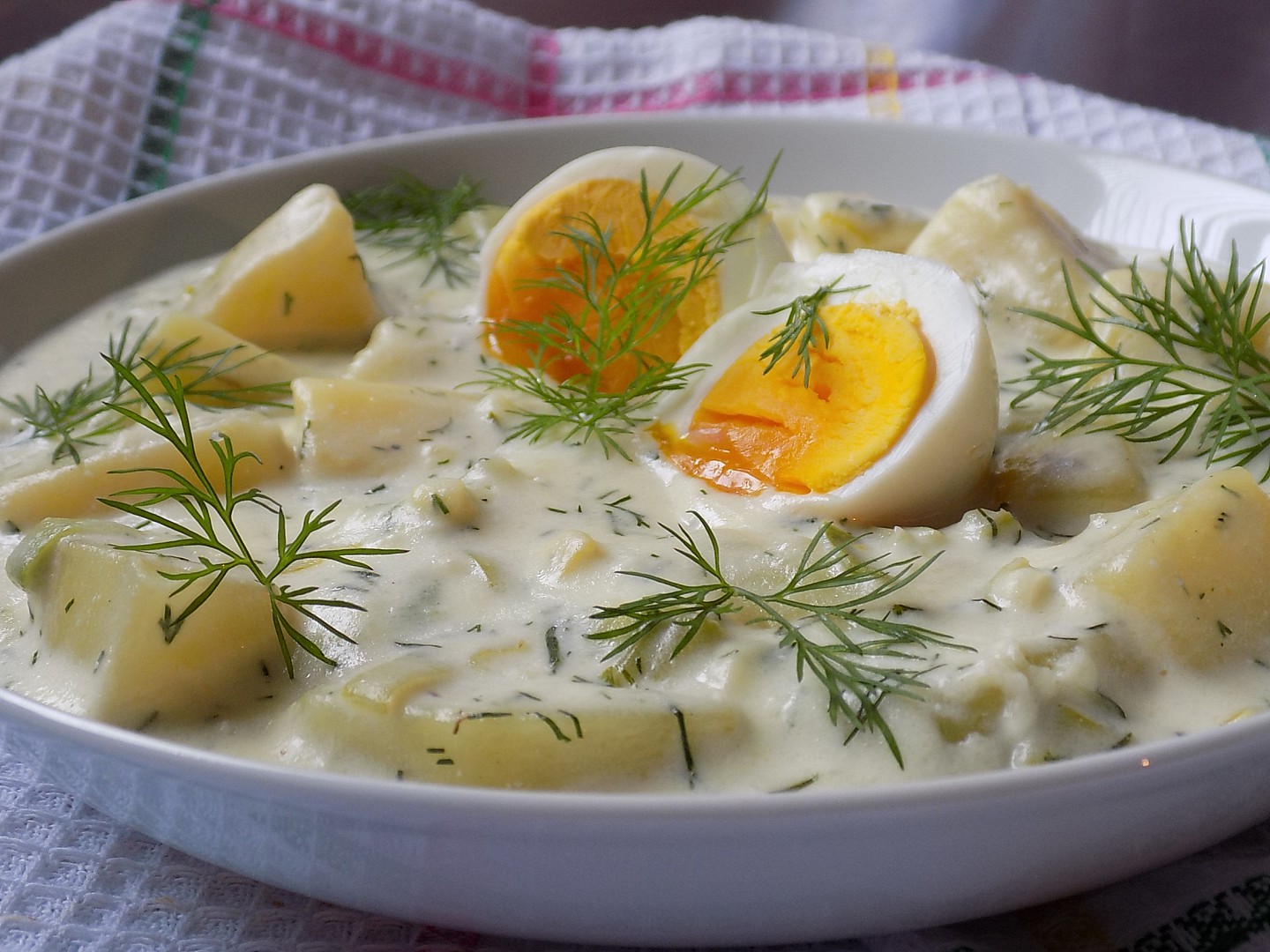 Přilijeme smetanu a nadrobíme brynzu. Pomalu zahříváme a mícháme, až se brynza rozpustí. Necháme chvíli povařit a vmícháme kopr nebo pažitku.