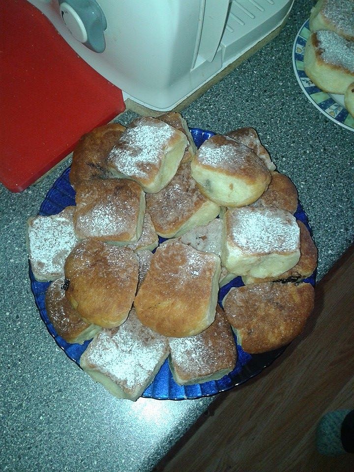 5. Po upečení vyklopíme na vál (pokud chceme mít vláčné kůrky potřeme buchty mlékem) Nakonec buchty pocukrujeme cukrem moučkou.