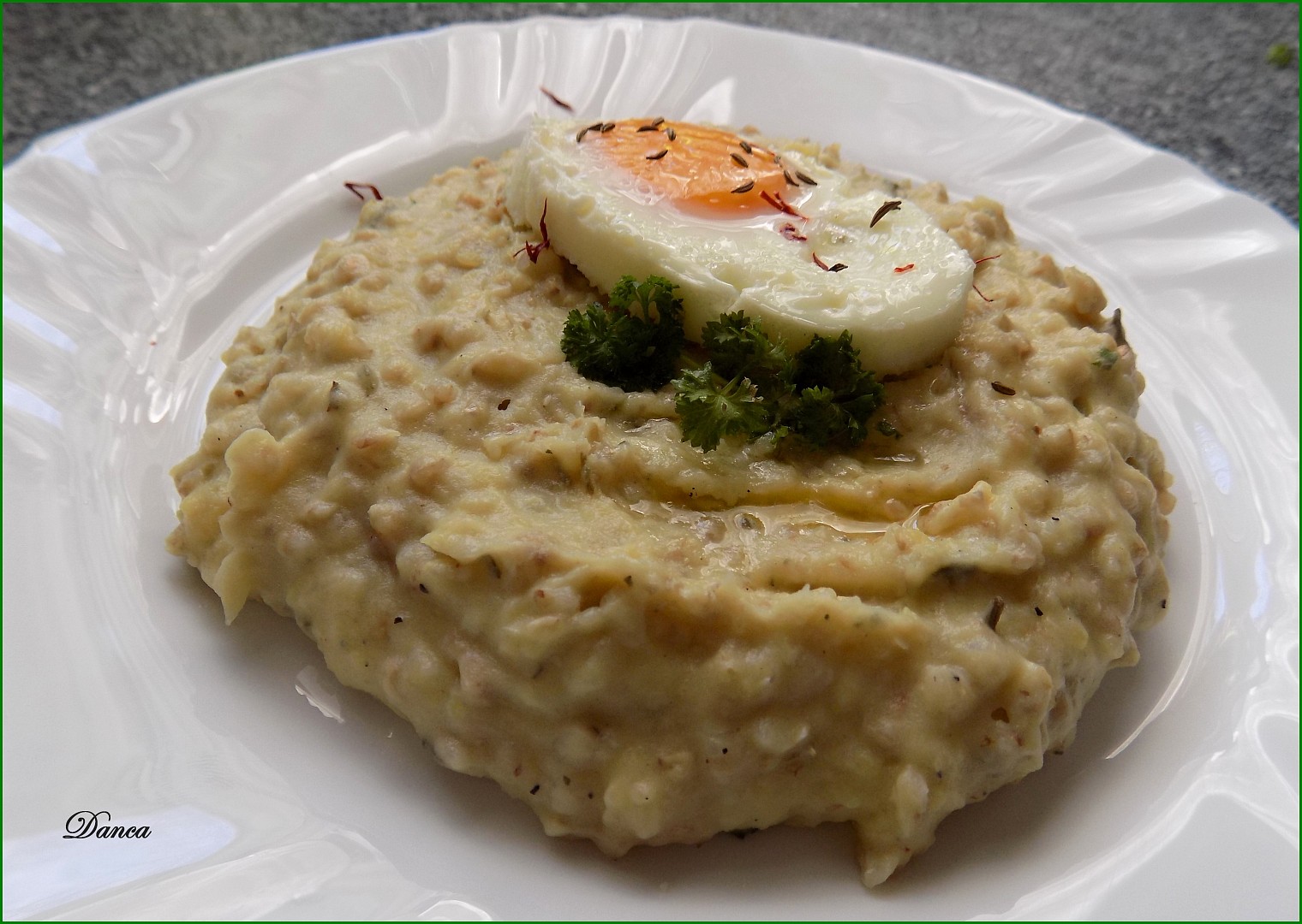 Poté přidáme zakysanou smetanu a bylinky a vyšleháme kaši, kterou nakonec dochutíme solí a trochou pepře. Na talířích poléváme rozpuštěným máslem a podáváme např. se sázeným vejcem.
