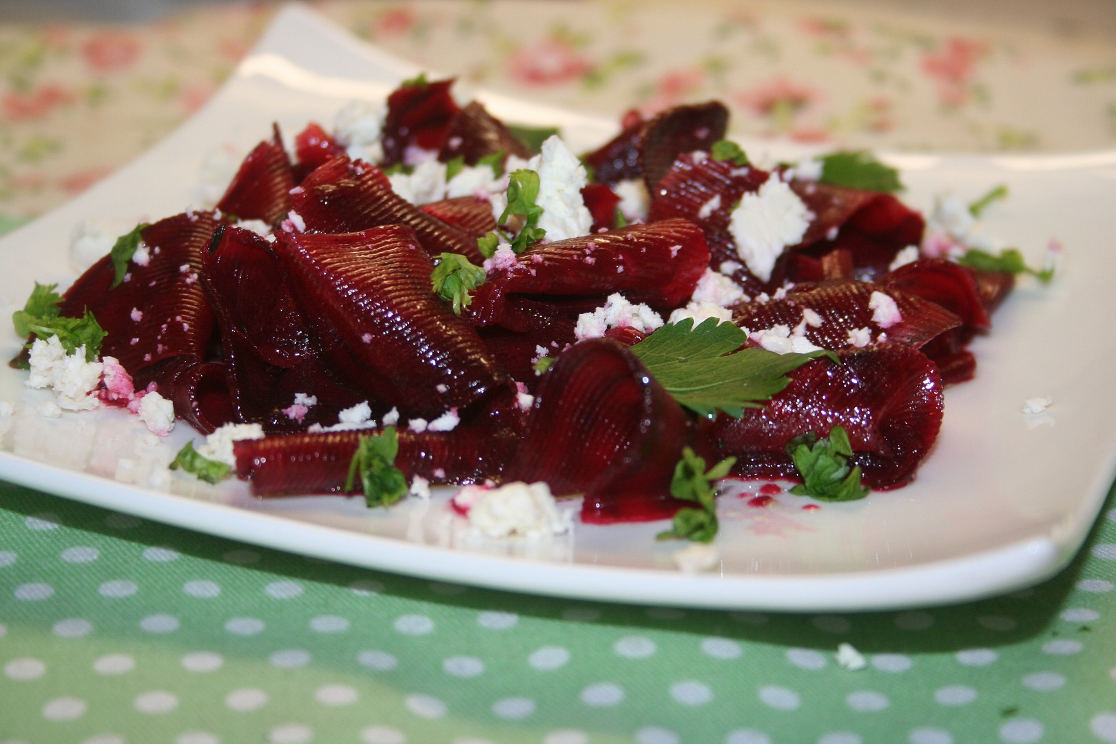 Pak plátky řepy naaranžujeme na talíř, poklademe hrudkami sýra a posypeme nasucho opraženými oříšky. Podáváme s bílou bagetou.