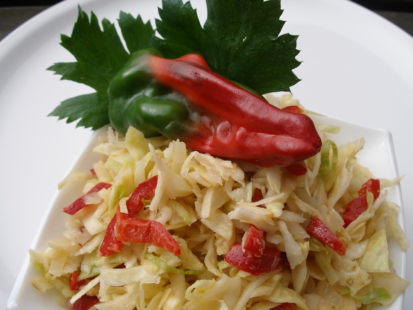 Zelí v misce hodně pomačkáme, aby nám změklo, přidáme nastrouhaný celer a na nudličky pokrájenou červenou papriku.