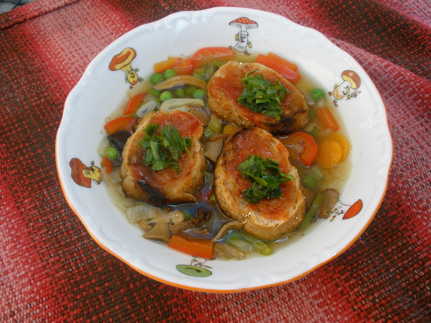 Ze zeleniny, bujonu a vody uvaříme polévku, do které před podáváním pokládáme topinkové kolečka potřené kečupem a posypané libečkem.