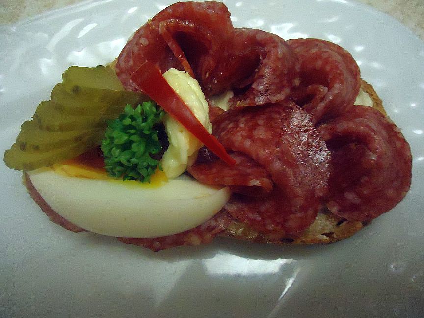 2. Na rovně položené kolečko dáme 1/5 z poloviny vařeného vejce, vějířek okurky ( okurku rozkrojíme podélně a pak děláme 4 řezy nedokrojené a pátým oddělíme). Pomocí vroubkového nože uděláme ozdobu z kousku másla a dozdobíme kouskem papriky a petrželky.