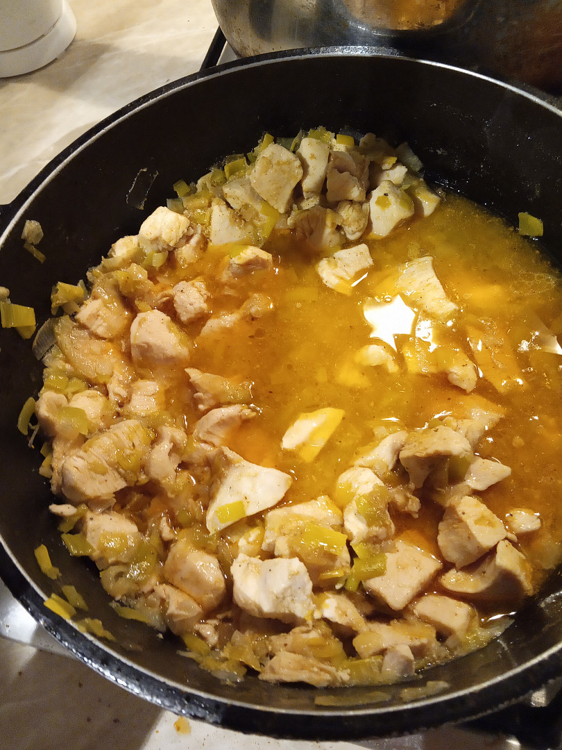 Maso na kostičky opečeme a přidáme nadrobno nakrájený porek.