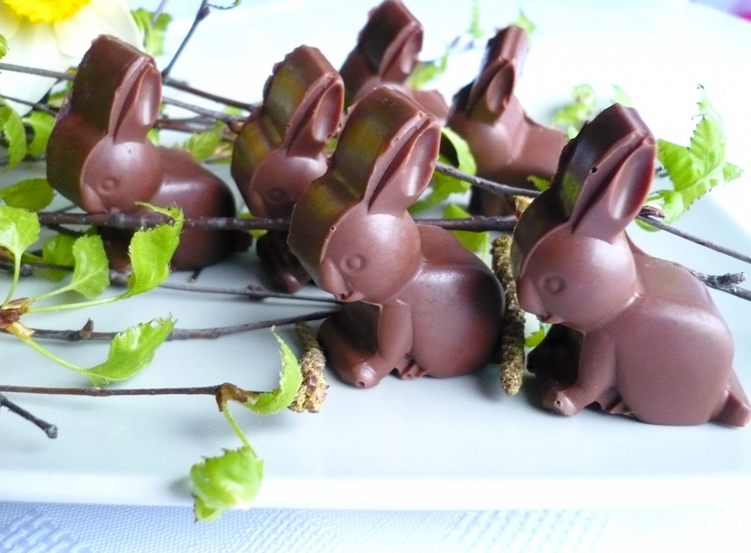 Silikonovou formu na čokoládu ve tvaru zajíčků za pomocí štětce v tenké vrstvě vymažeme rozpuštěnou čokoládou, dáme do chladu a po ztuhnutí ještě jednou zopakujeme. Opět dáme do chladu, pak přidáme náplň a opět dáme ztuhnout. Pak ještě shora čokoládou zajíčky uzavřeme a dáme na několik hodin důkladně ztuhnout. Pak zajíčky opatrně z formy vyloupneme.
