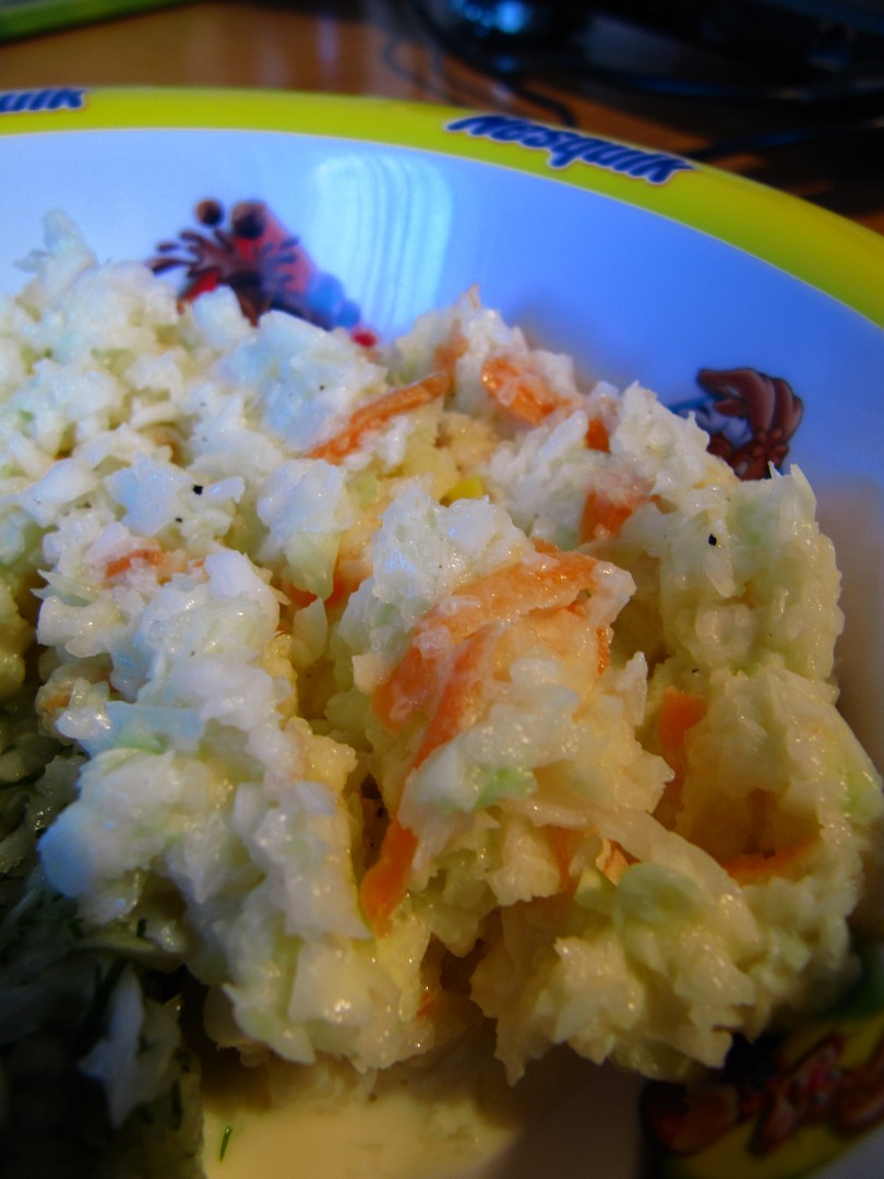 Zelí si buď nakrájíme na menší kousky nebo dáme do mixéru. Mrkev si nastrouháme na hrubém struhadle a cibuli nakrájíme nadrobno. Zeleninu smícháme a přidáme 1 lžičku olivového oleje.