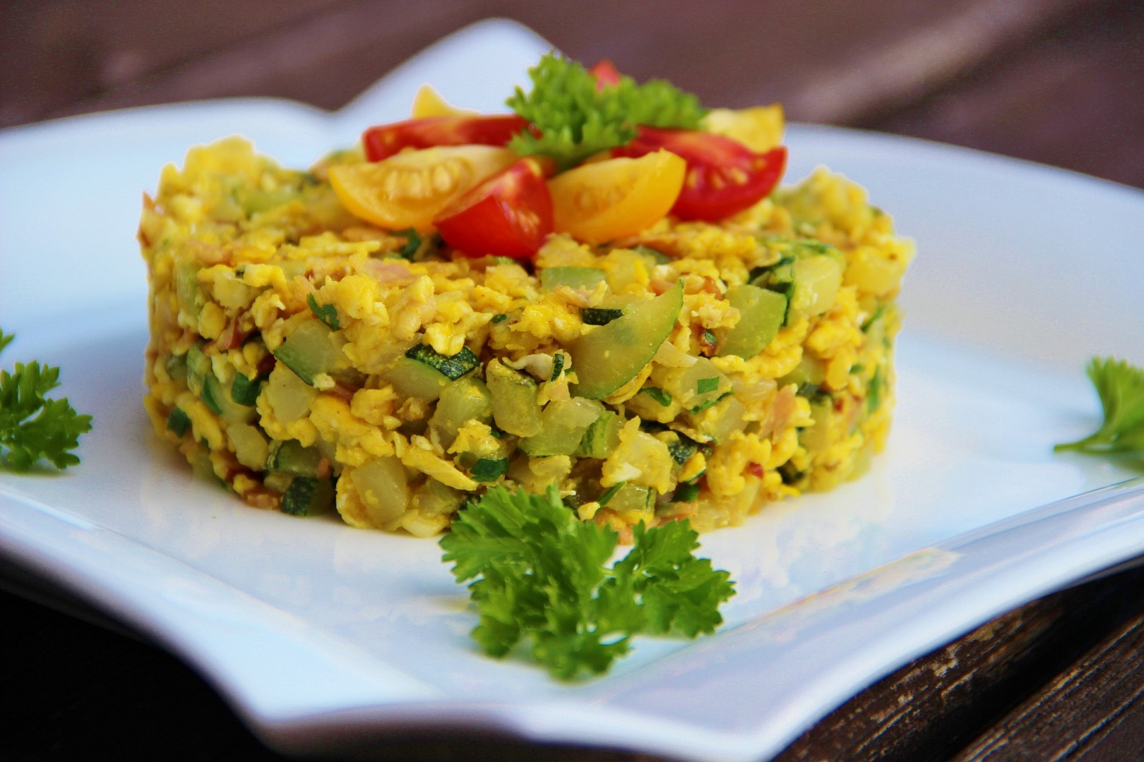 Cibuli, slaninu a cuketu nakrájíme na malé kostičky. Na másle zesklovatíme cibuli a orestujeme slaninu. Přidáme cuketu,posekaný česnek, osolíme, okmínujeme a dusíme tak dlouho, dokud nebude cuketa na skus, nesmí se úplně rozdusit. Nakonec vlijeme vejce, necháme srazit a vmícháme posekanou petrželku. Případně dochutíme solí.