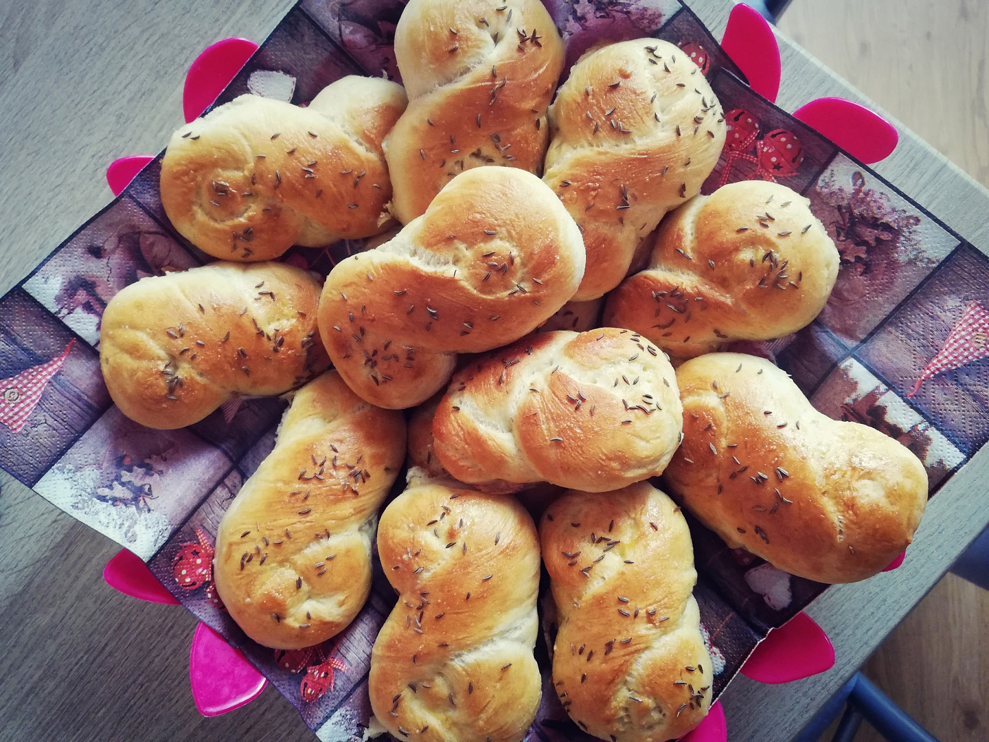 Troubu předehřejeme na 220 stupňů. Těsto rozdělíme na 15 dílků a upleteme houstičky, které ukládáme na plech. Aby v troubě zezlátly, potřeme je rozšlehaným vejcem s trochou soli, potřeme každou zvlášť. Posypeme kmínem a dáme péct.