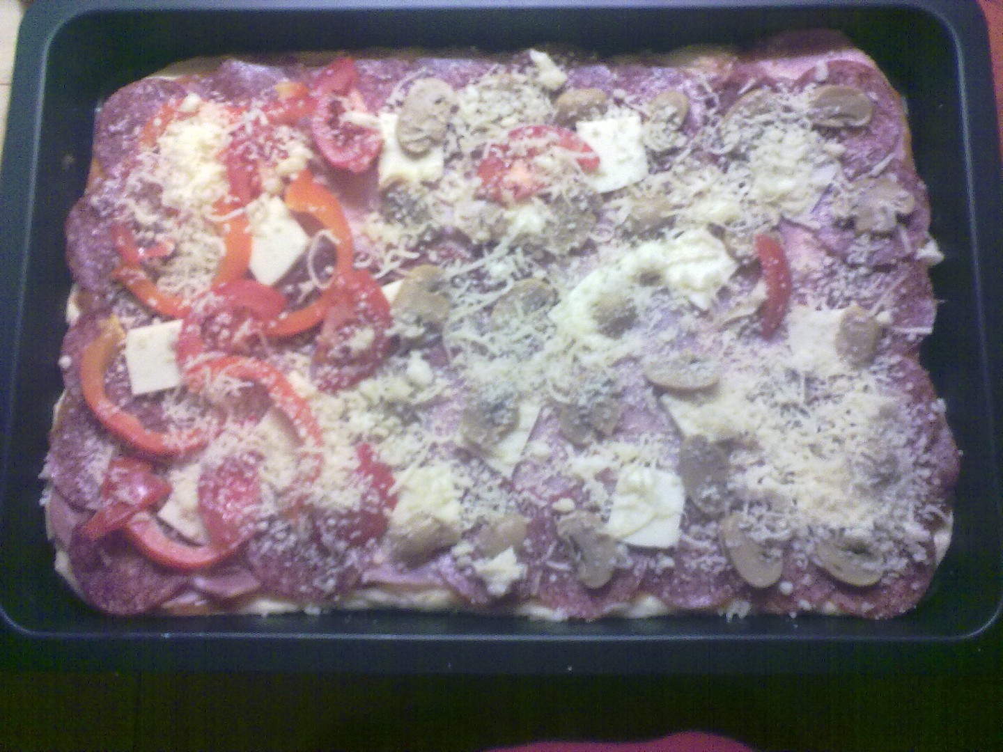 3. Na to přidáme šunku, sýr, žampiony, papriku, rajče a nakonec to posypeme strouhaným sýrem a oregánem.