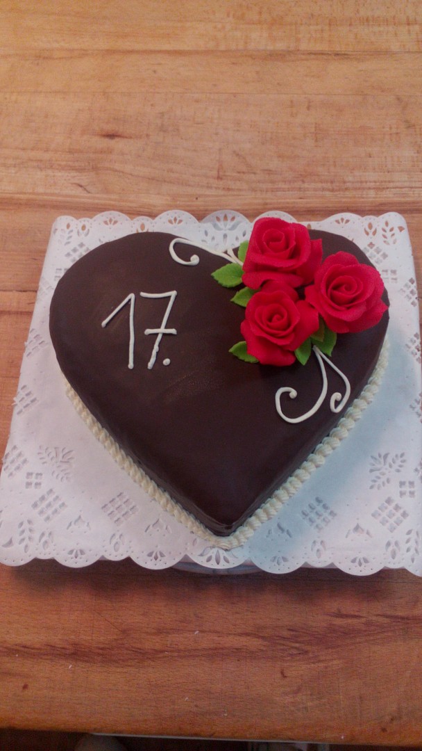 Piškot si prokrojíme, potřeme marmeládou, navrstvíme krém a necháme ztuhnout. Povrch dokonale uhladíme a polijeme čokoládovou polevou. Zdobíme růžičkami.