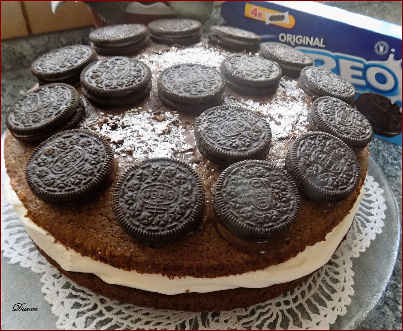 5. Upečený a vychladlý korpus prořízneme, naplníme krémem a povrch ozdobíme sušenkami Oreo, které přilepíme trochou rozpuštěné čokolády.