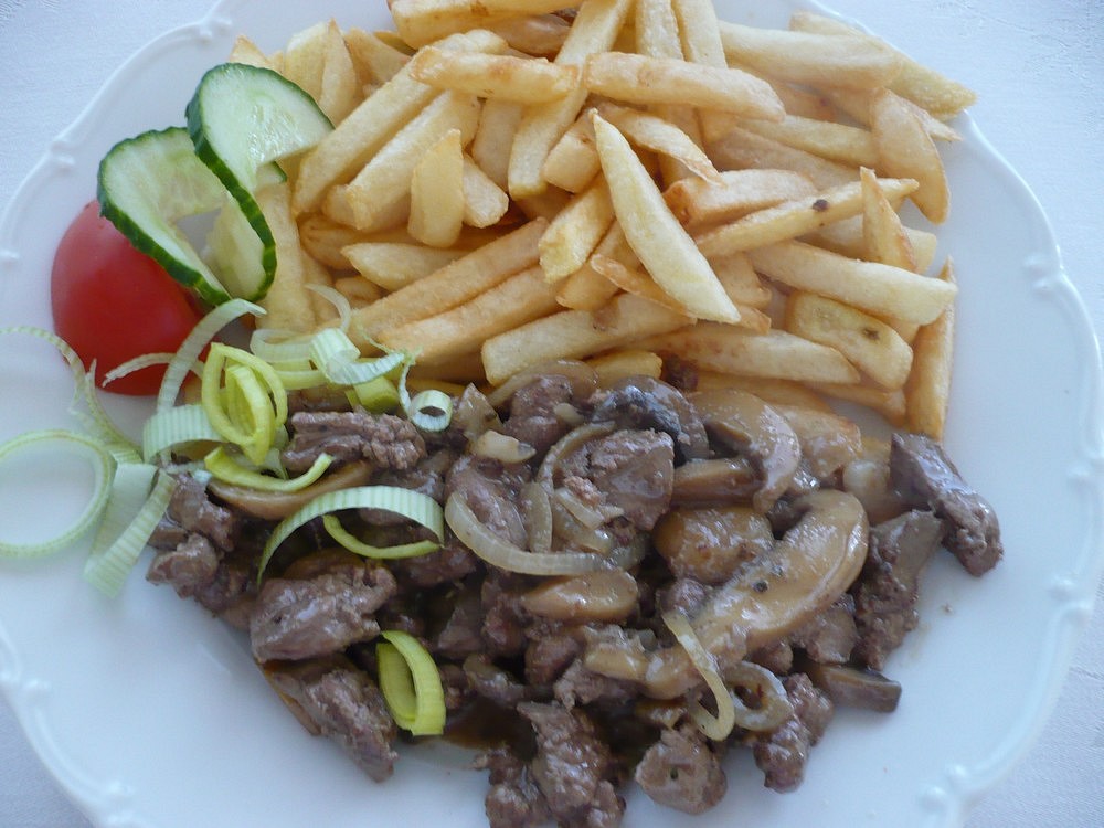 Na oleji zpěníme pokrájené cibule, osmahneme a pak přidáme pokrájená játra. Osmažíme, nakonec osolíme. Podáváme s chlebem.