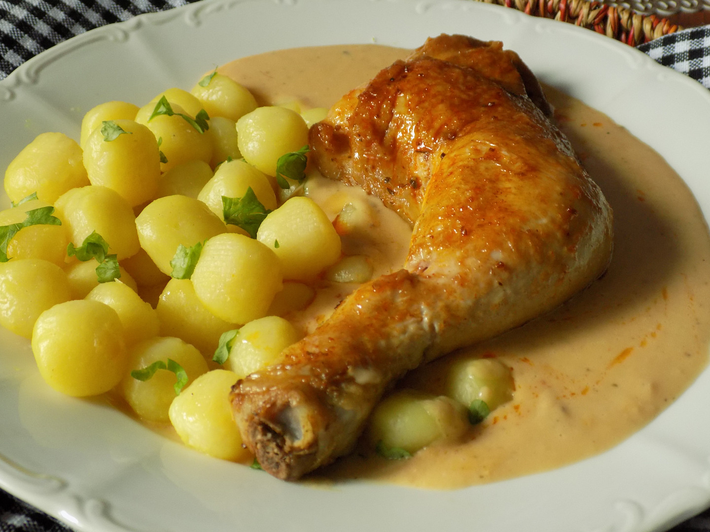 Omytá a osušená stehna osolíme. Smícháme trochu oleje s paprikou a stehna potřeme. V pánvi rozehřejeme olej a stehna zprudka opečeme z obou stran, nejdříve kůží dolů.