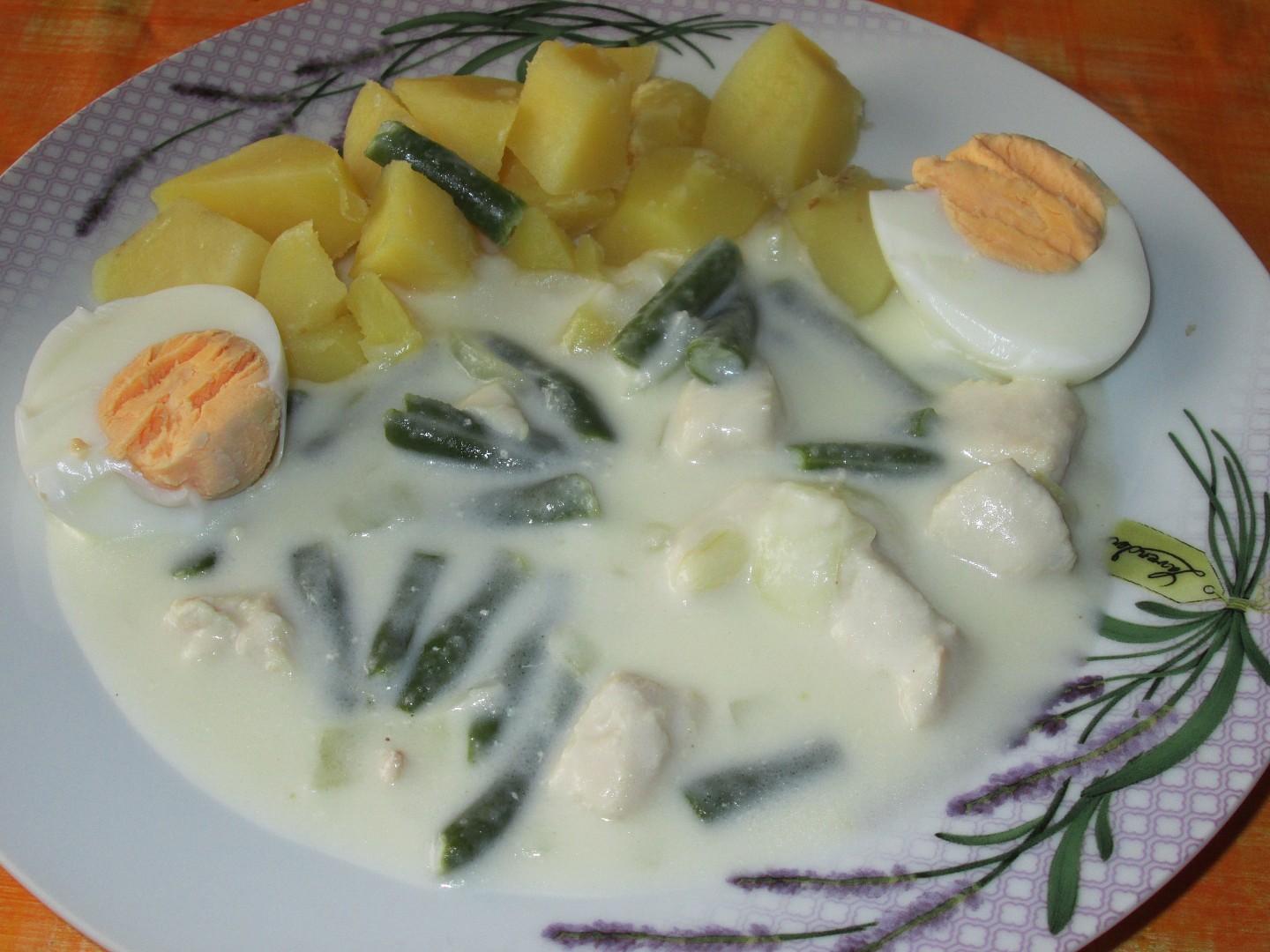 Když je maso a fazolky měkké, zalijeme mlékem, ve kterém rozmícháme mouku. Necháme povařit a na konec přidáme smetanu. Pro ozdobu jsem uvařila i vejce natrvdo, ale nemusí být.