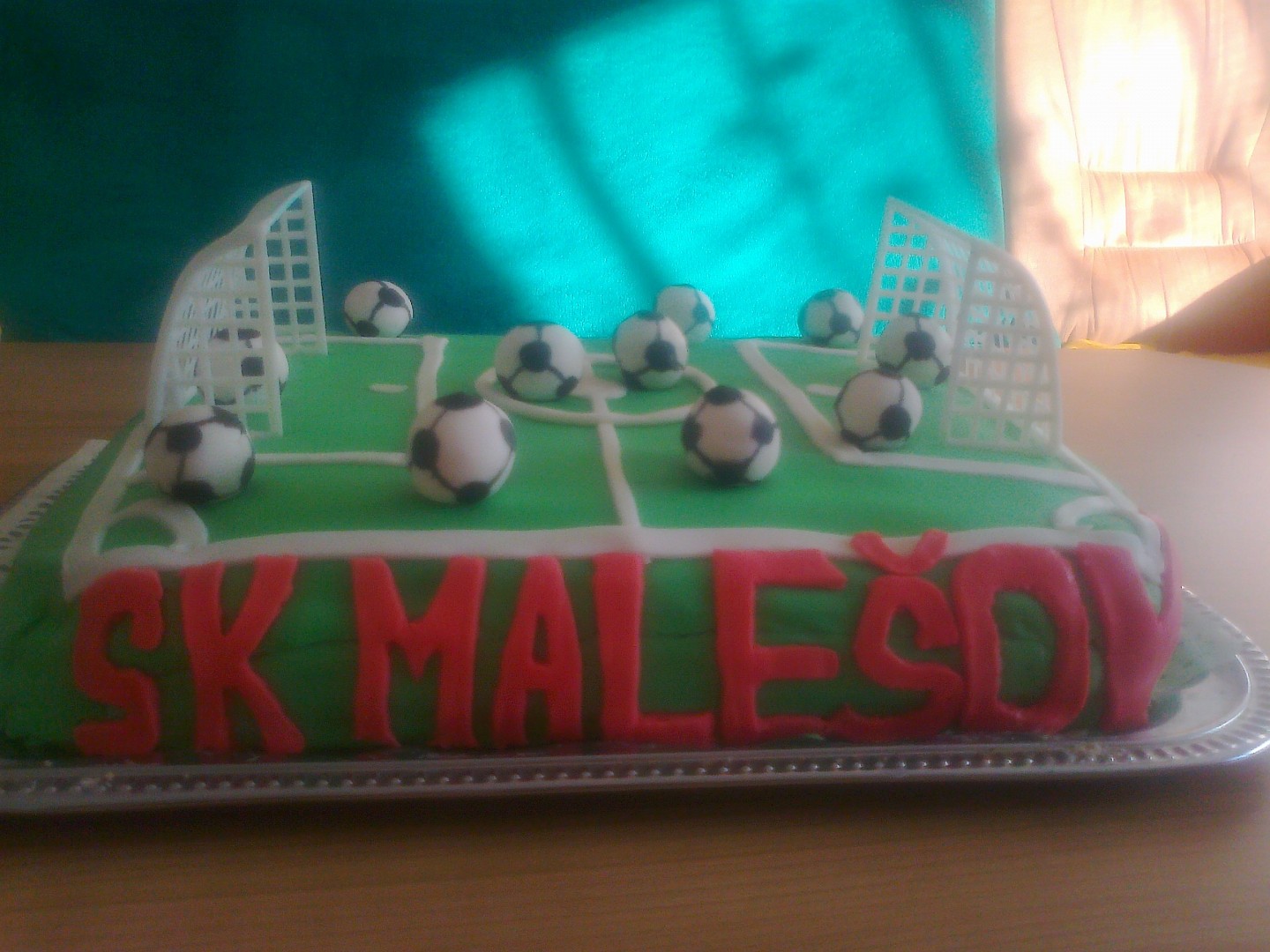 Hmotu si obarvíme na zeleno a potáhneme s ní dort. Dále jsem si zapíchla umělohmotné branky a bílou hmotou vytvarovala čáry na hřiště.