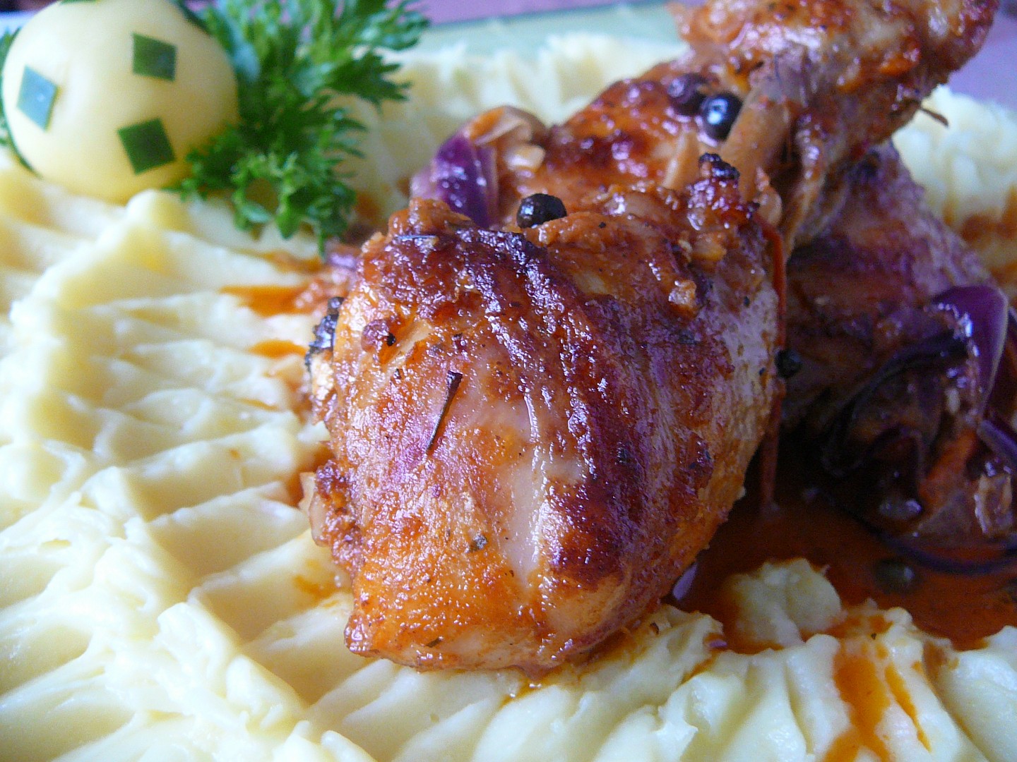 Druhý den vložíme do pekáče i s marinádou, přidáme, kuličky pepře, nového koření a bobkový list, trochu podlijeme a pečeme zakryté asi 40 – 50 minut, potom pečeme odkryté, aby kuře mělo křupavou kůrčičku. Během pečením podle potřeby podlijeme vodou.