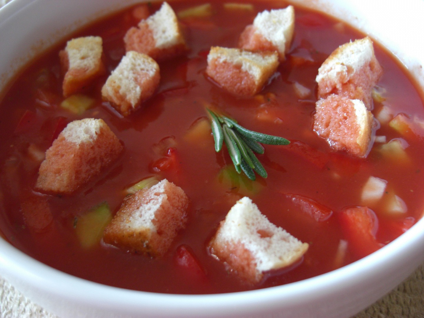 Do mísy dáme kostičky zeleniny, nasekané bylinky, zalijeme ochucenou rajčatovou šťávou, případně doředíme vodou, dochutíme solí a octem a vychladíme. Podáváme s krutonky chleba.