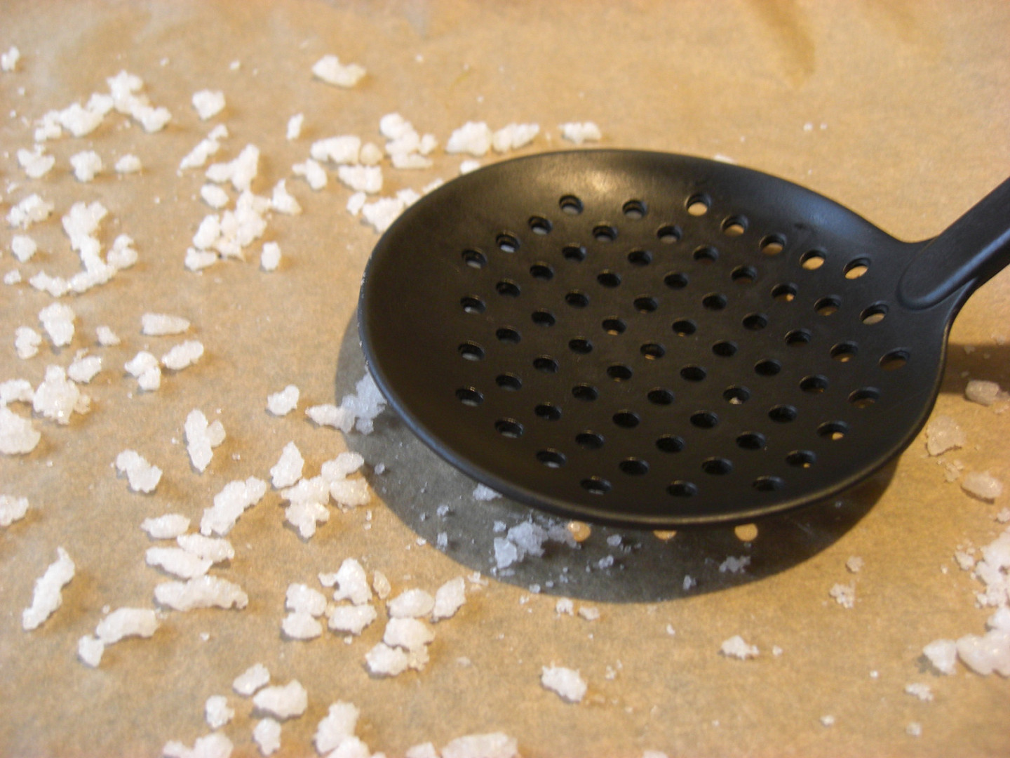 2. Plech pokryjeme papírem na pečení. Použijeme děrovanou obracečku a lžíci nebo stěrku. Nabíráme mokrý cukr a přes dírky protlačujeme na papír. Dbáme, abychom na papír nedávali cukru mnoho, jinak by se mohl slepit.