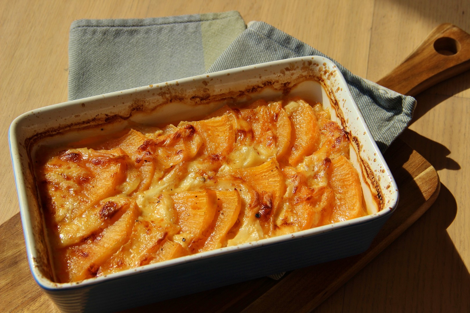 Tento recept vznikl tak trochu na základě francouzského pokrmu Tartiflette, což jsou gratinované brambory s aromatickým sýrem reblochon. Tuřín je celkem chuťově “ nevýrazný „, což dovoluje trochu experimentů. Ještě bych pro příště zvolila určitě trochu čerstvého tymiánu. Kdo má rád “ voňavé “ sýry, určitě si pochutná tak jako já 🙂