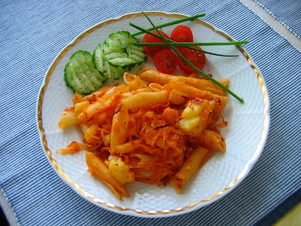 Těstoviny uvaříme obvyklým způsobem. Na trošce oleje osmažíme cibulku, slaninu, poté přidáme zelí, sladkou papriku, pepř, kmín, sůl (můžete i trochu cukru) a chviličku podusíme.