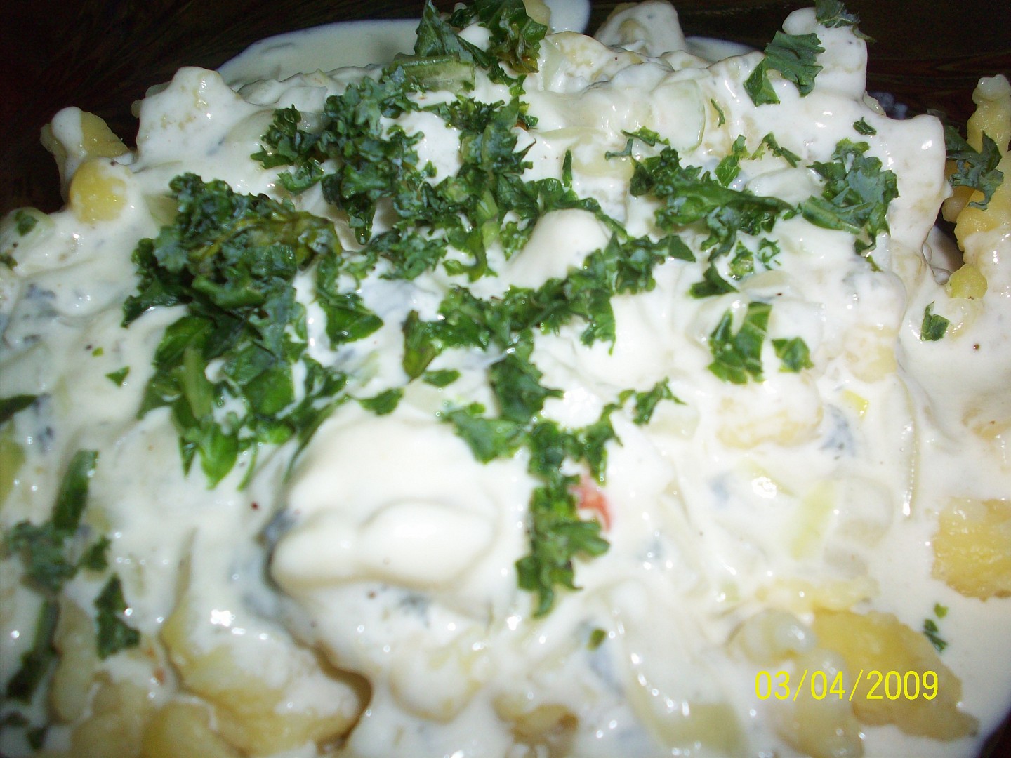 Halušky uvařte podle návodu – prášek rozmíchejte ve vodě a vařte 1 minutu, zpěňte na oleji cibulku, přidejte trochu muškátového oříšku, smetanu a okořeňte.