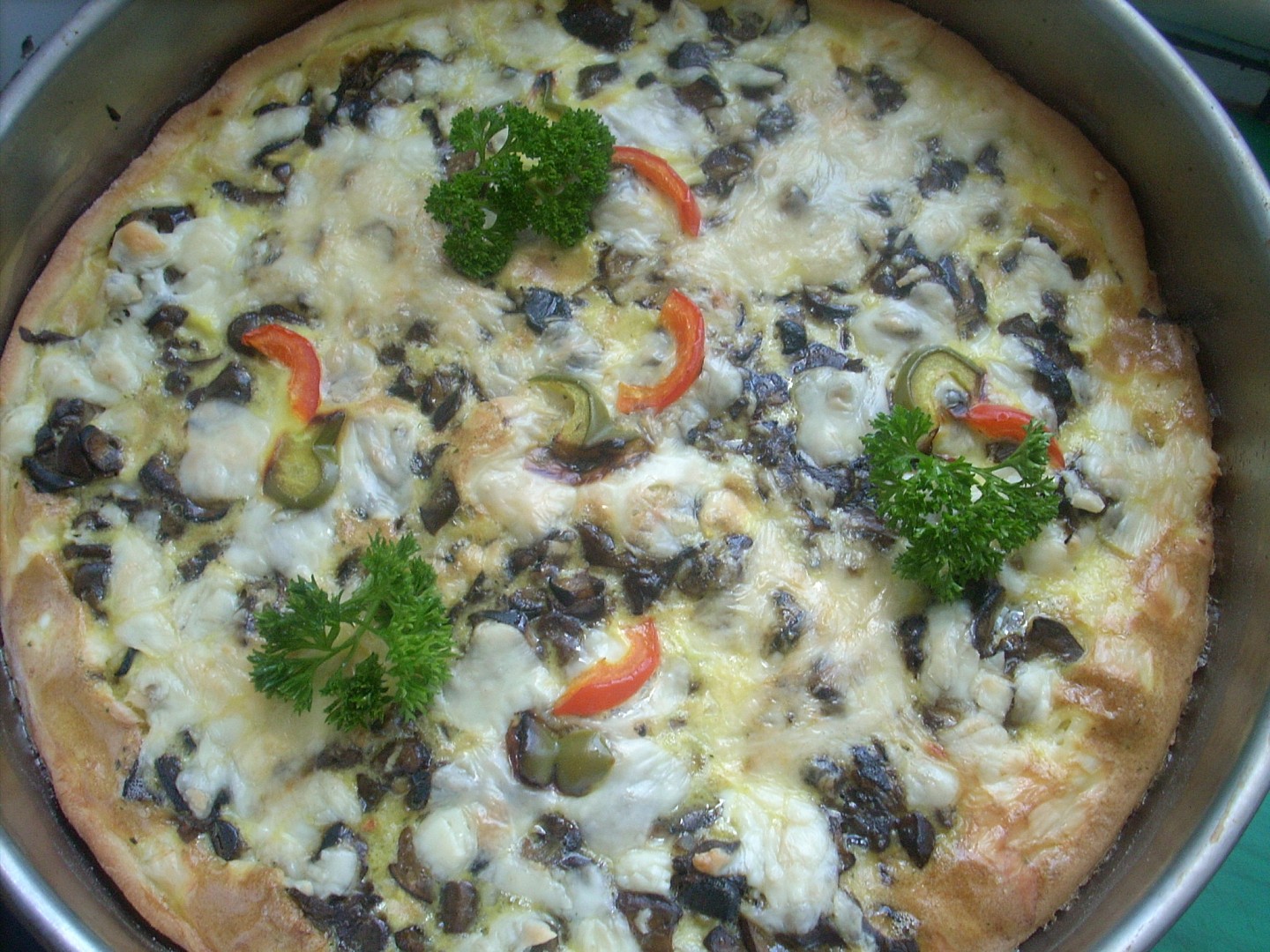 Poklademe zchladlými houbami a zalijeme rozšlehanými vajíčky.