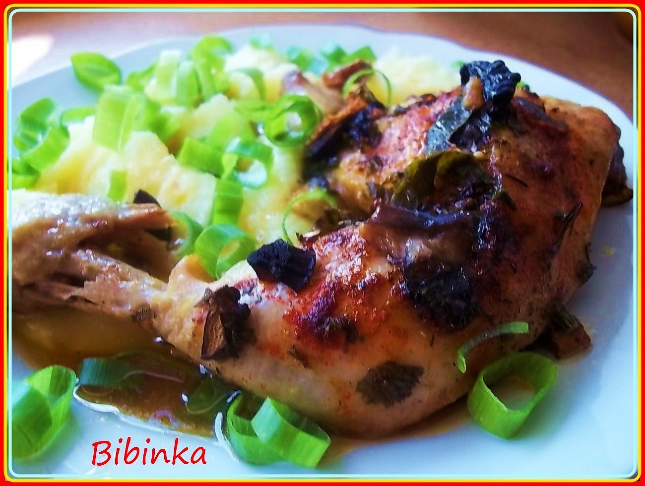 Celerovou nať jsem si připravovala do mrazáku na zimu a ona tááák úžasně voněla, že jsem jí musela použít, houby ještě byly čerstvé a nápad byl na světě. Chuť šťávy a kuřete je moc dobrá! To černé navrchu stehna jsou natě, které pečením ztmavnou, ale není to vůbec na závadu!!!