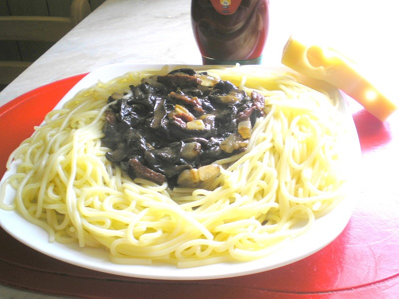 Buď vmícháme přímo do špaget, nebo jako na fotce. Dobrý je i tvrdý sýr. Špagety se lépe navinujou. Kečup, pouze kdo je zvyklý – vezme jídlu trochu chuť.