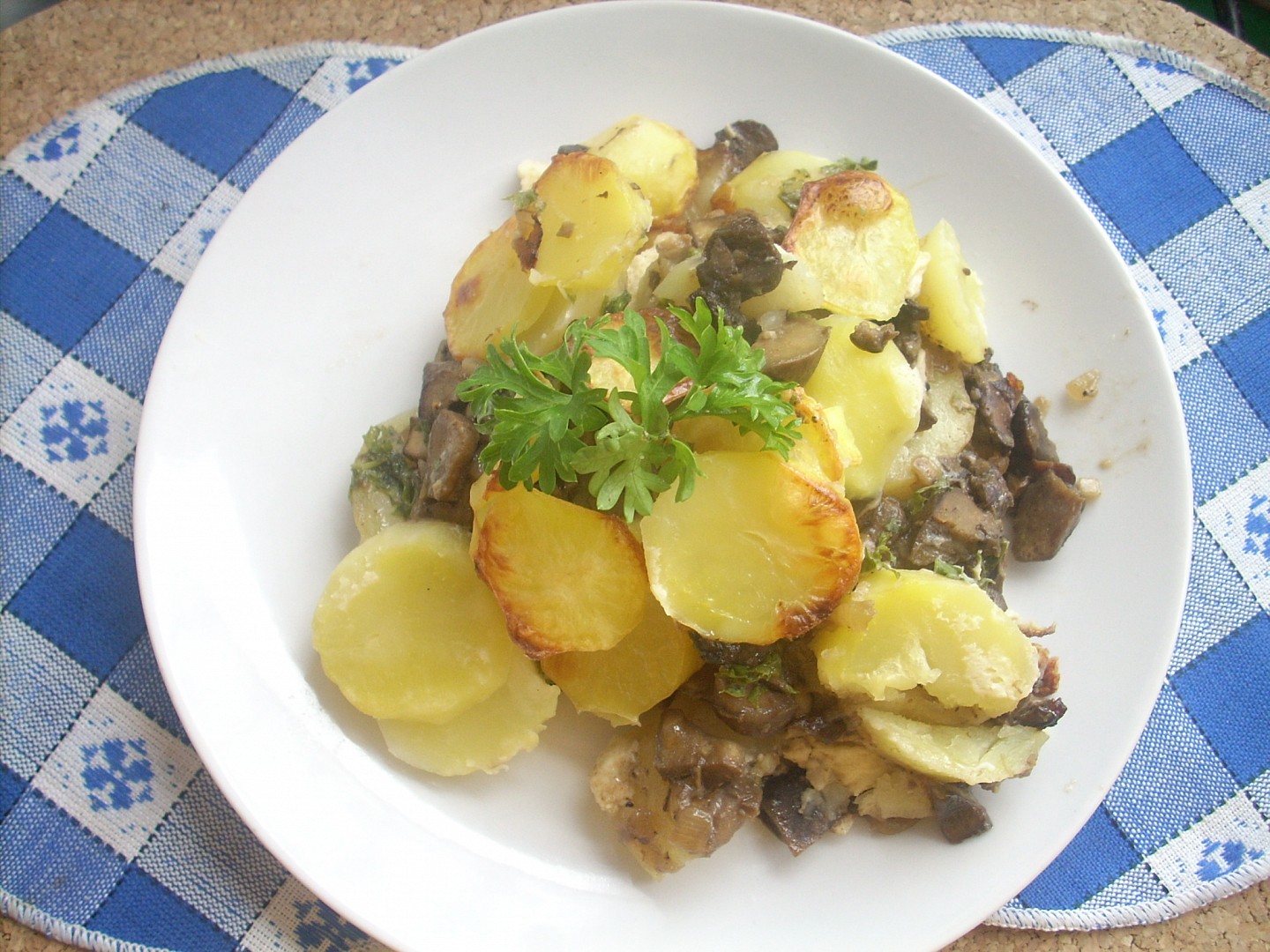 Pak přidáme prochladlé houby a posypeme petrželkou. Nakonec dáme zase brambory a zalijeme je vejci rozkverlanými v mléce. Upečeme dozlatova.