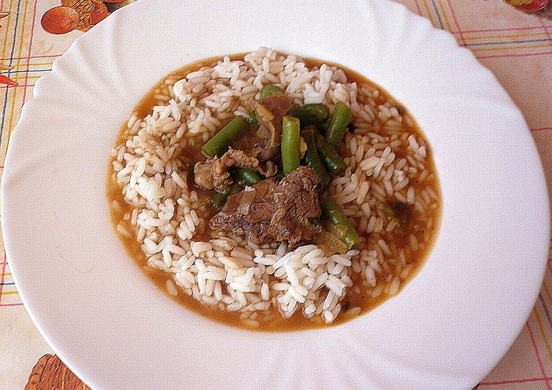 Přidáme fazolky a ještě chvíli povaříme. Podáváme rýží.