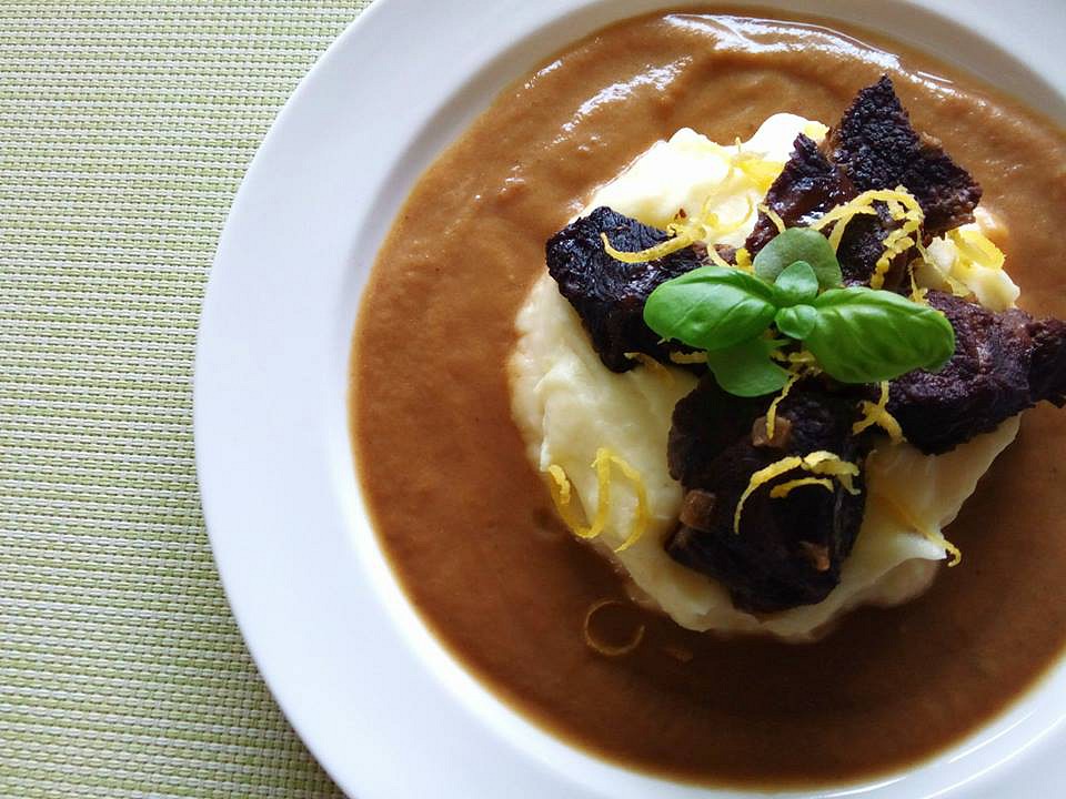 Hovězí líčka na černém pivě a zelenině s bramborovo-citronovou kaší