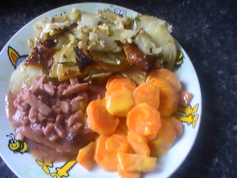 Nakrajet na kolecka, dat do pekacku, posolime, popeprime, zakapnem trochou oleje a zalijem zalivkou, kterou sme si udelali ze slehacky, 2 lzice medu, trochu soli, 2 vejce, ja jsem na chut jeste dala nakrajenou pazitku. Poradne promichat, zalit brambory a dat pect.