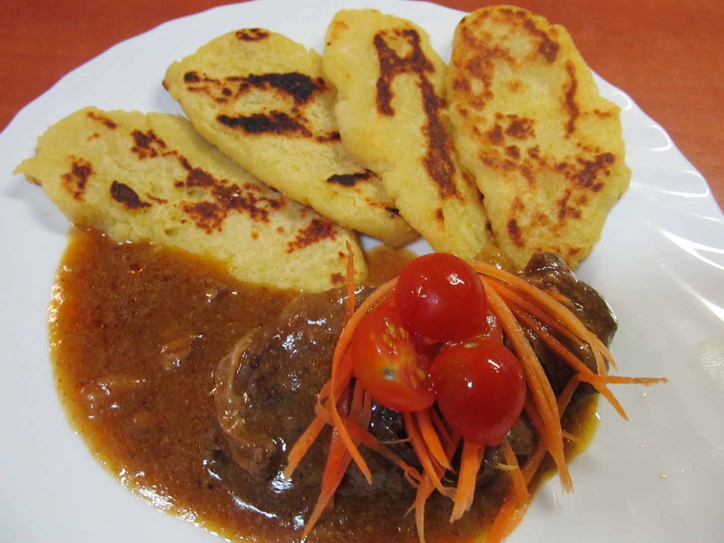2. Brambory oloupeme ,na jemno nastrouháme, přidáme vejce, osolíme a přidáme krupičku. Přilijeme trochu vody a vypracujeme vláčné těsto, uděláme šišku a z ní krájíme tenké plátky, které ještě trochu rozválíme.