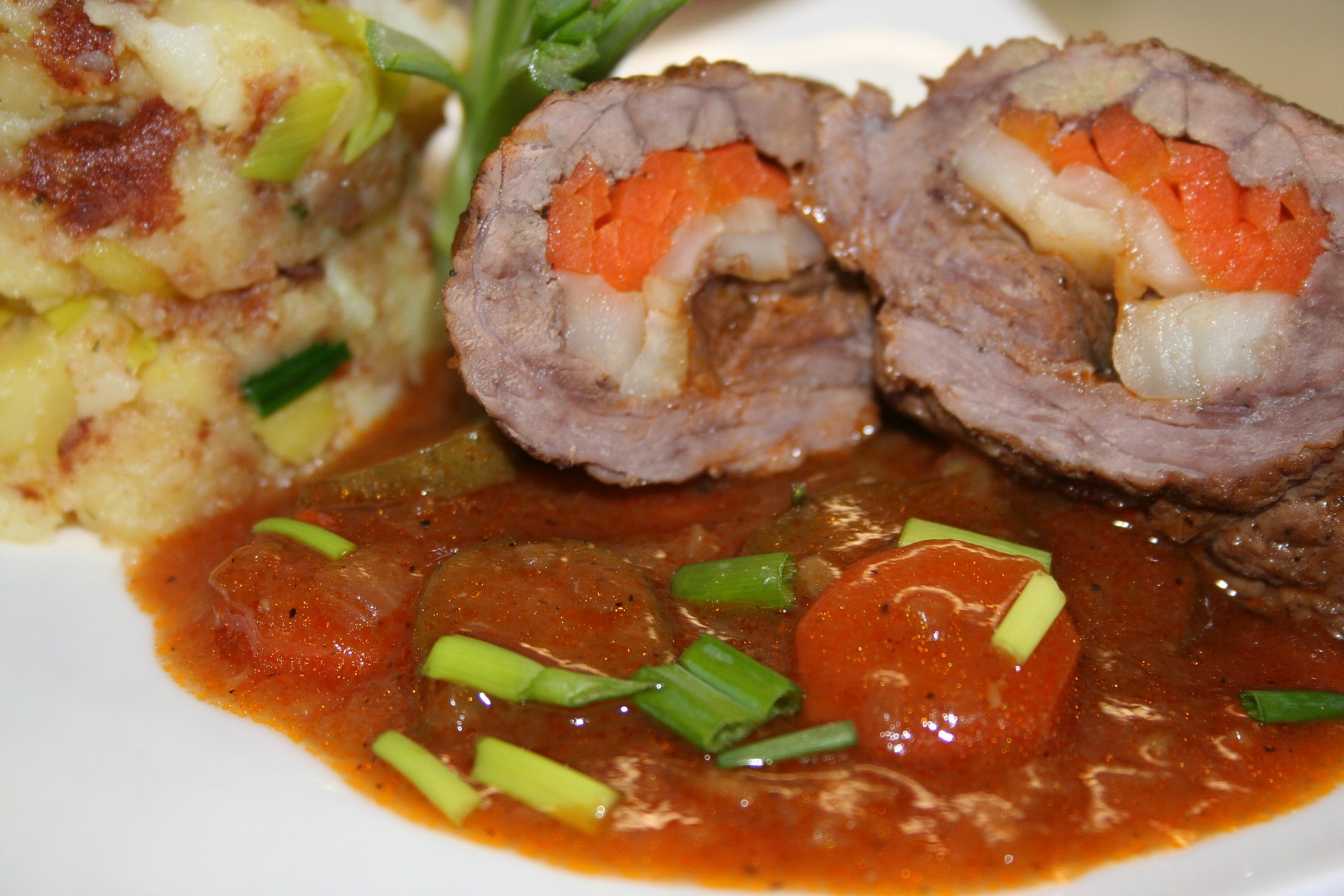 Do masa nastrkáme mrkev a celer, stáhneme maso provázkem.
