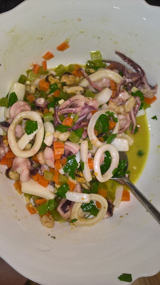 Máte-li čerstvé mořské plody, očistěte je obvyklým způsobem a uvařte v bílém víně s citrónovou šťávou, nejprve chobotničky a olihně asi 15 minut, přidejte krevety, mušle a nechte vařit dalších 5 minut. Vyberte děrovanou naběračkou a dejte stranou. Použijete-li mražené, již upravené a předvařené, nerozmrazujte a vhoďte rovnou do ochuceného vroucího vína a jen nechte přejít varem.