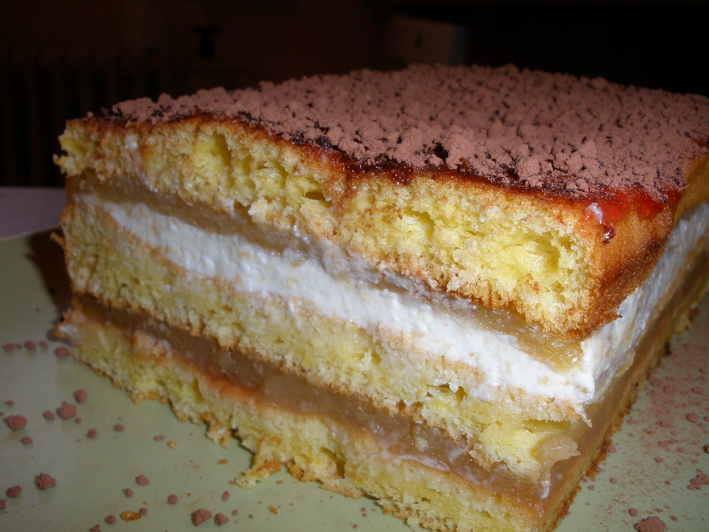 Plnění: plát těsta, marmeláda, jabl.náplň, plát těsta, tvar. náplň, jabl. náplň, plát těsta, marmeláda a nakonec posypeme grankem. Dáme vychladit.
