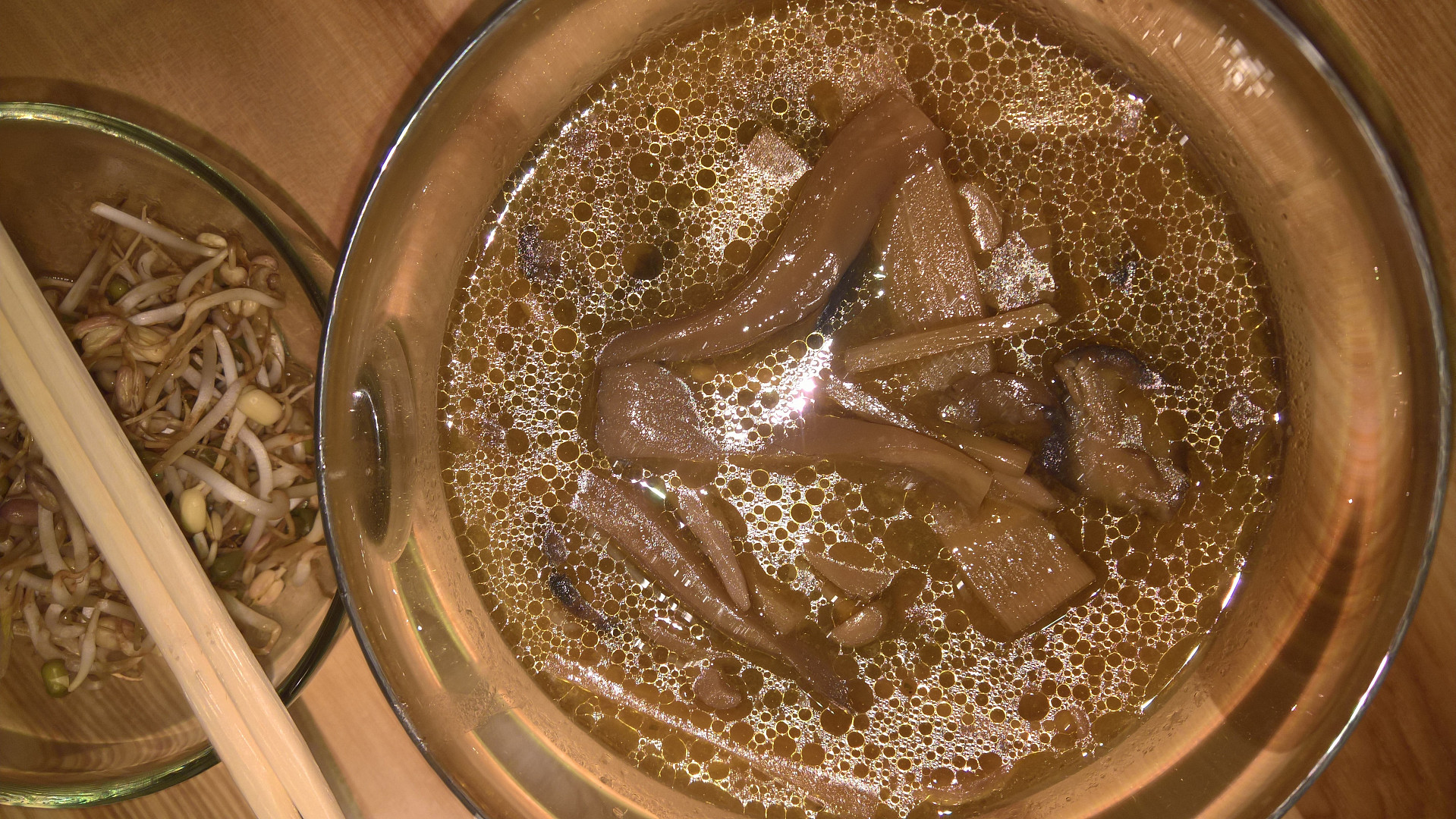 3. Ve woku rozpalte rýžový olej, přihoďte shitake a smažte asi 5 minut, přidejte hlívu a česnek a smažte další 2 minut. Zalijte vývarem (vodou), vhoďte čili papričky a povařte, aby houby změkly.