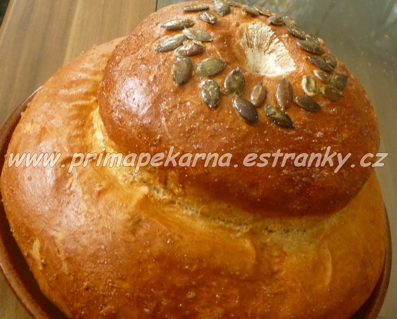 Vykynutý chleba potřeme vejcem s trochou vody, vařečkou obnovíme důlek, můžeme ozdobit i semínky (použila jsem dýňová) a vložíme do vyhřáté trouby. Prvních 5-10 minut pečeme na 220°C, pak zmírníme na 190-200°C a dopečeme, ještě asi 35-45 minut. (Každá trouba peče jinak.) Chleba výrazně voní a díky nezvyklému tvaru přitahuje i oči – krajíce vypadají jako obláčky. (Těsto nemusíte dělat jen v pekárně, můžete klidně i ručně nebo robotem.)