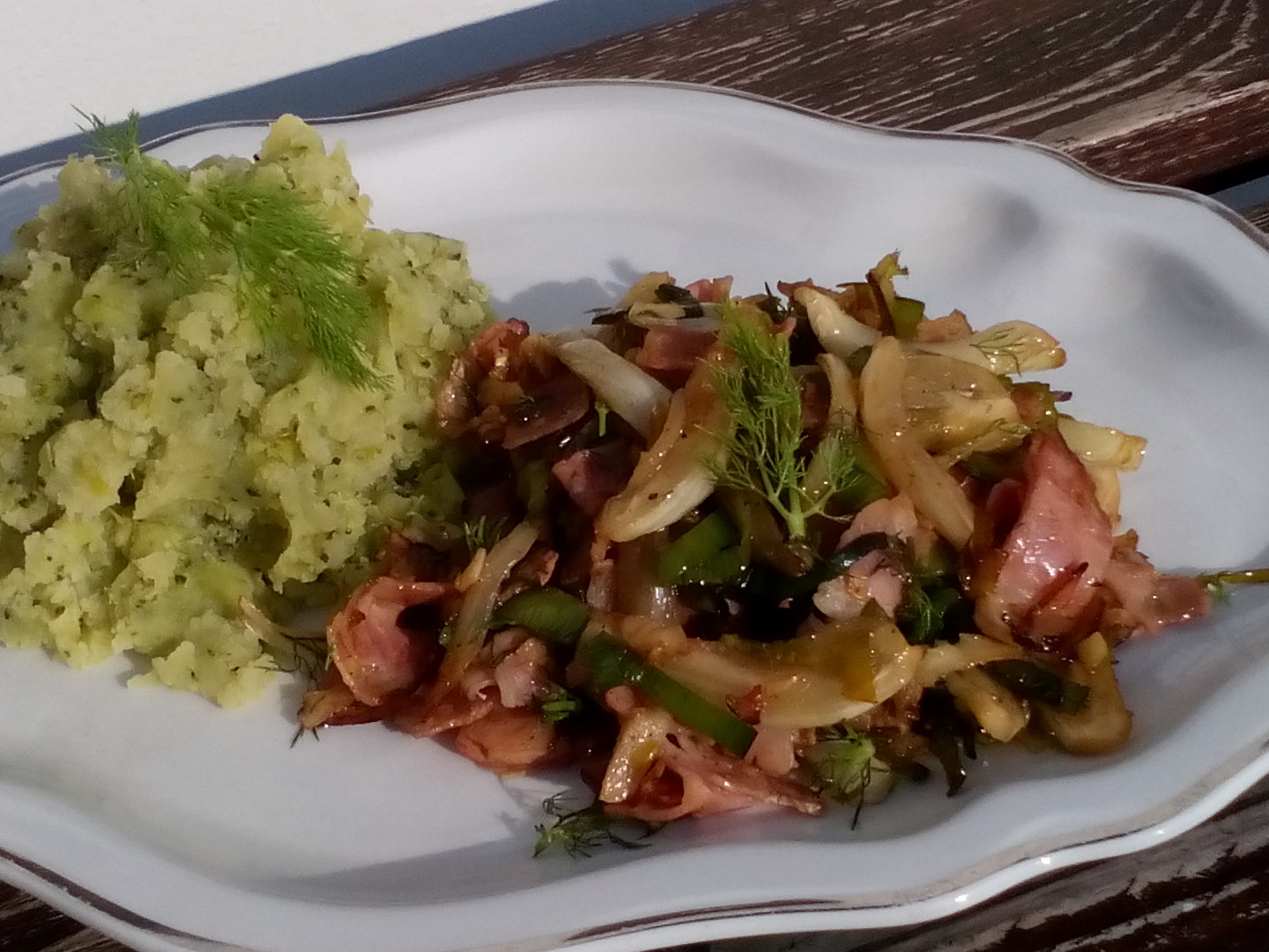 2. Poté přisypeme slabě pokrájenou slaninu, drobně nasekaný zázvor s česnekem, osolíme a opepříme dle chuti a krátce dosmažíme doměkka a do barvy. Dle chuti můžeme přidat pár kapek worcesteru nebo sojové omáčky a po odstavení můžeme do směsi vmíchat i drobně nasekanou fenyklovou nať.
