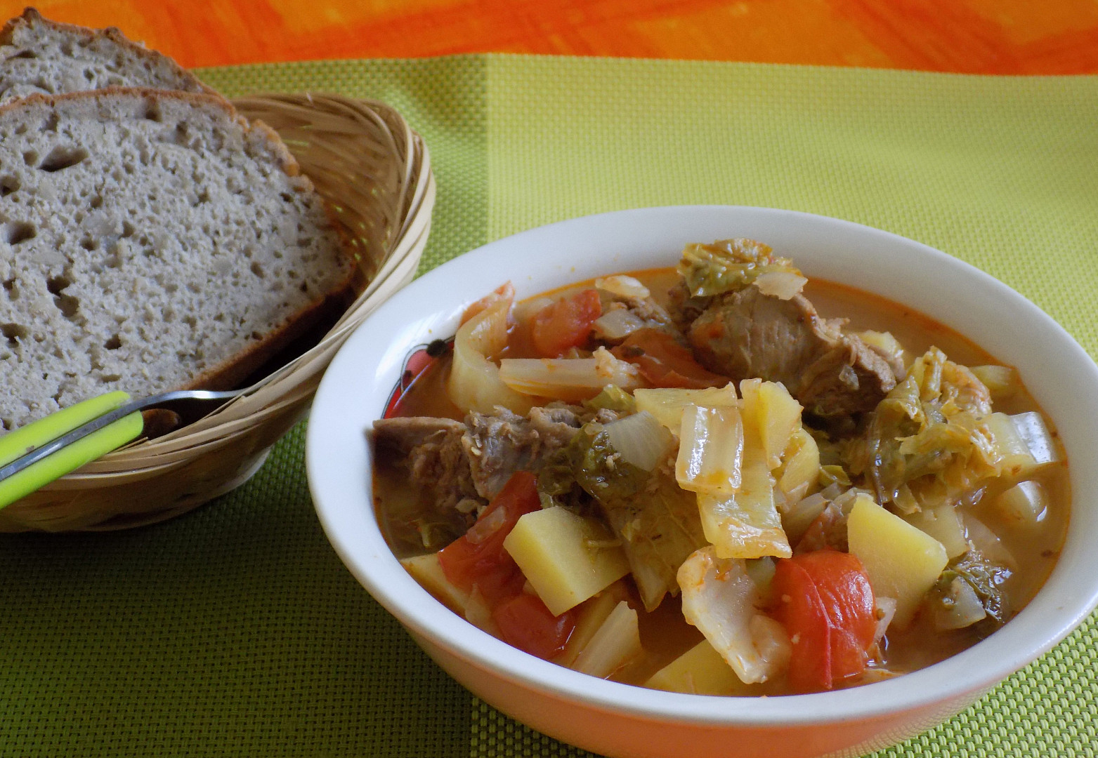 2. Pridáme narezanú kapustu,na kocky nakrájané zemiaky a paradajky a na rezance narezanú papriku. Varíme domäkka.