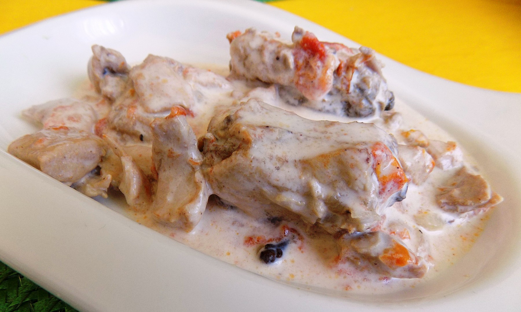 Cesnak a zázvor s troškou vody rozmixujeme na pastu a pridáme k mäsu. Pridáme koreniny II., na kocky narezané paradajky a opäť krátko orestujeme.