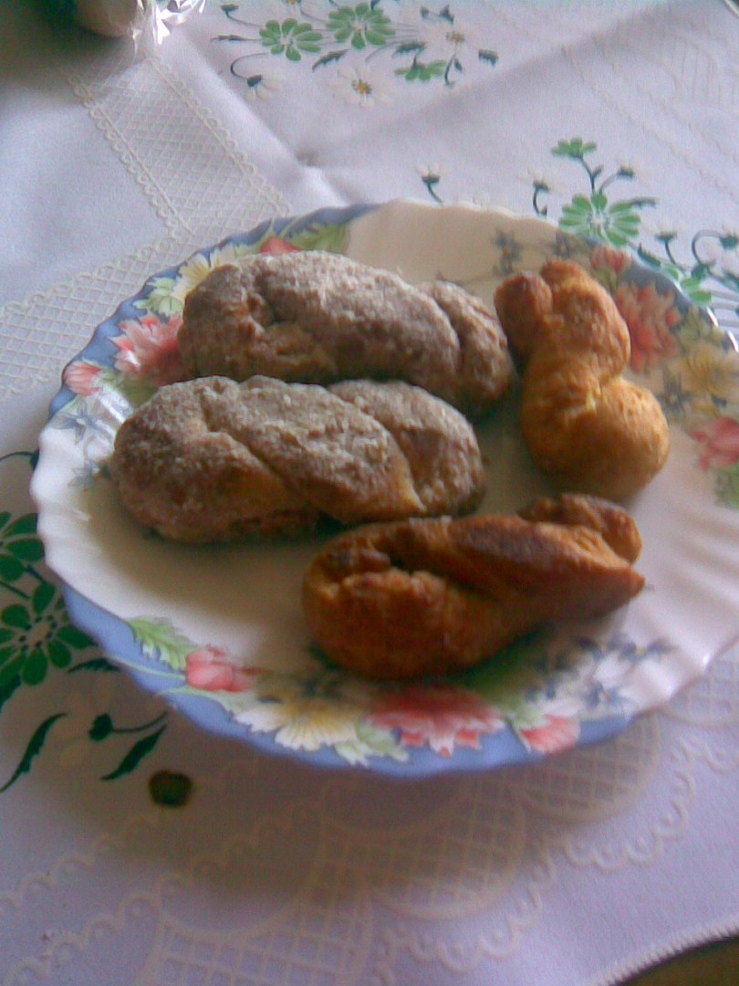 Vypracovat těsto, zabalit do fólie a nechat 30 minut odpočinout v lednici. Pak vyválet slabé „proužky“, uplést provazy a smažit v oleji. Teplé obalit ve skořicovém cukru (nemusí být).