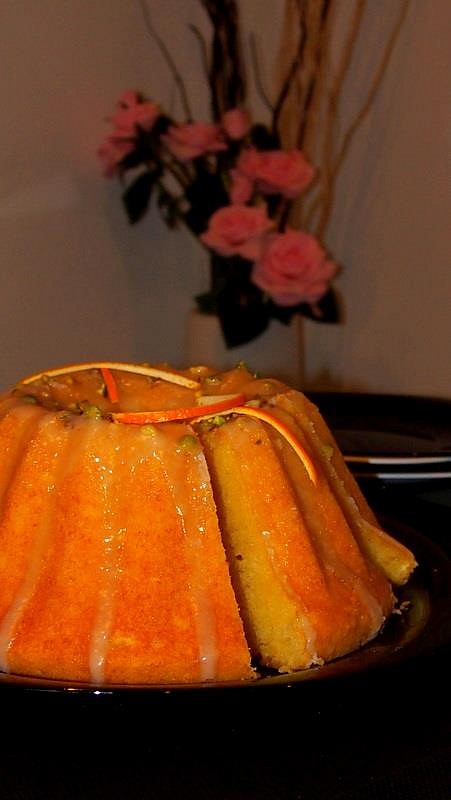 2. Formu vymažeme a vysypeme moukou. Vlijeme těsto a pečeme asi 45 minut na 180°C. Polijeme pomerančovou polevou z moučkového cukru a pomerančové šťávy. Sypeme pistáciemi.